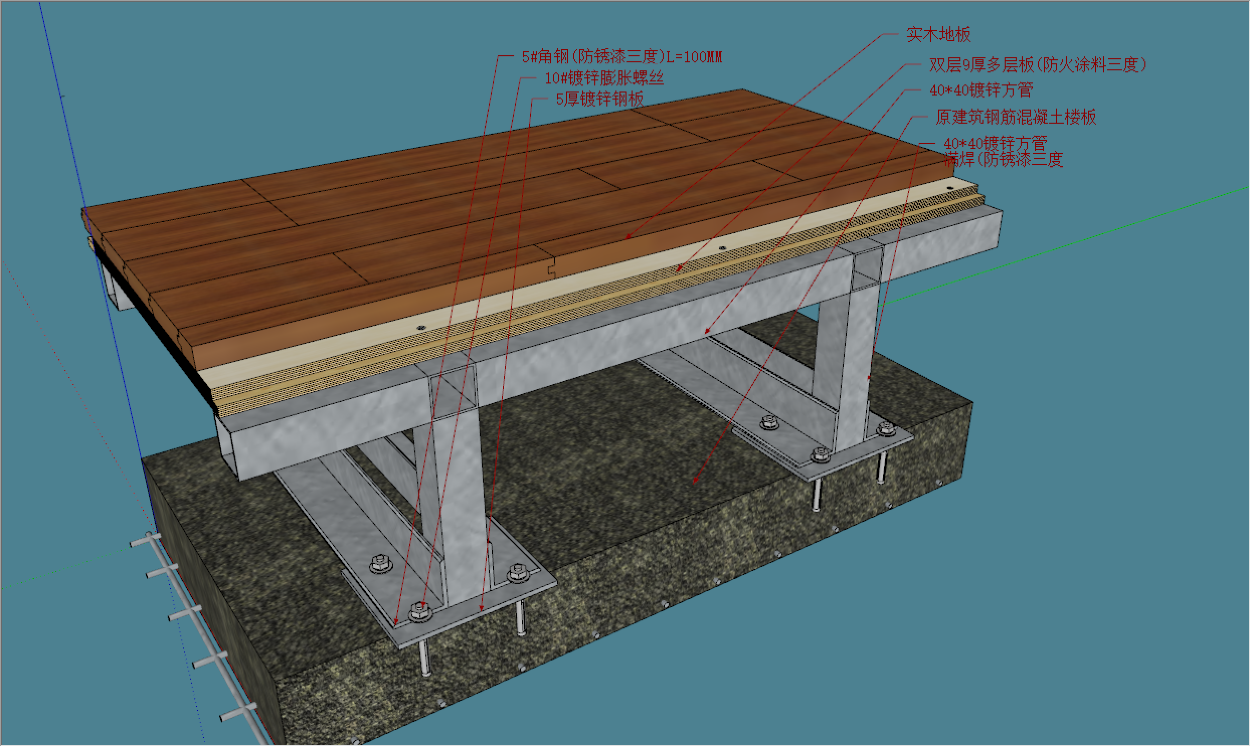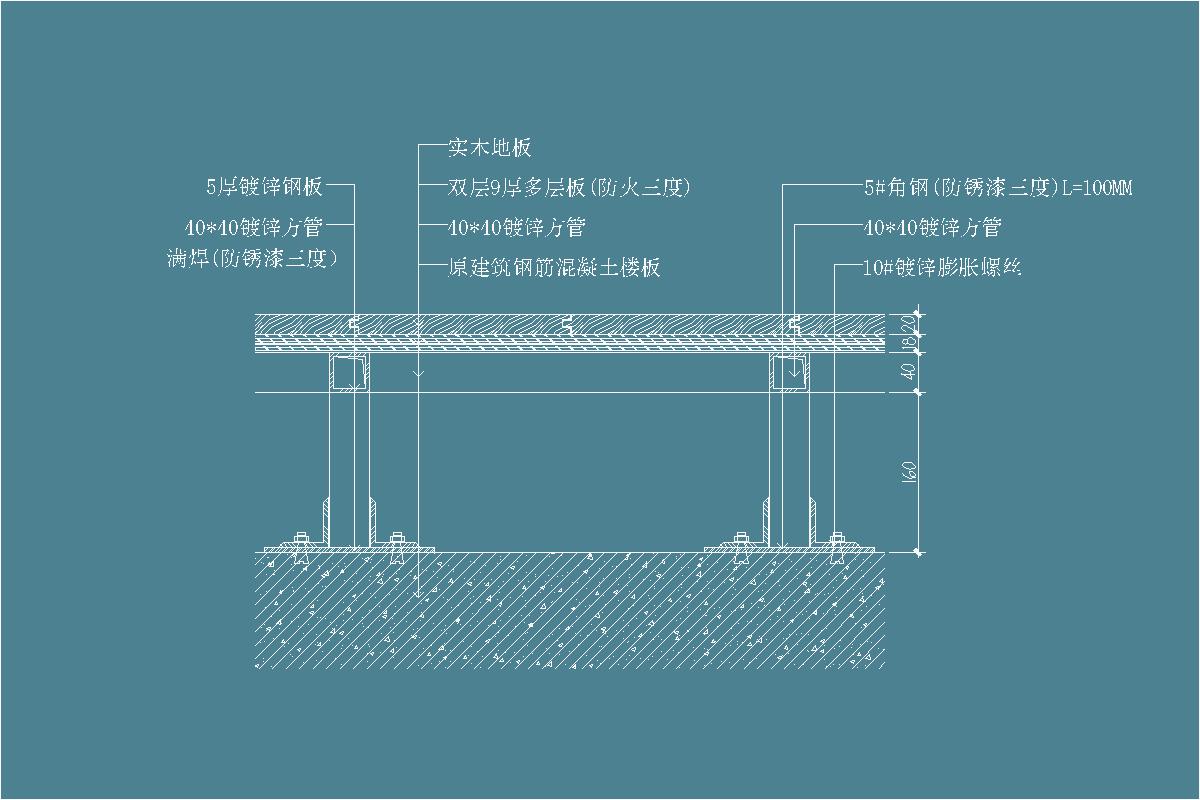 实木地板-多层板-镀锌方管-角钢-防锈漆-镀锌膨胀螺丝-镀锌钢板-舞台-讲台-地坪节点剖面详图 积木 2025-08-07 地面节点 108 推广 实木地板(槽钢架空) 1、本做法不需要在楼板面钻孔、射钉或预留钢筋处置子,用专用“实木地板胶”粘剂粘结即可,该胶粘剂强度高、碉潮、耐温;2、设计时应考虑地板下通风,并在施工图中绘出地板通风篦子和龙骨通风孔位置及大样 注:1.适用于舞台或讲台2.设计要求燃烧性能为B1级时,应按消防部门有关要求加作相应的防火处理 资源下载下载价格2 筑匠币VIP免费立即购买 0 0