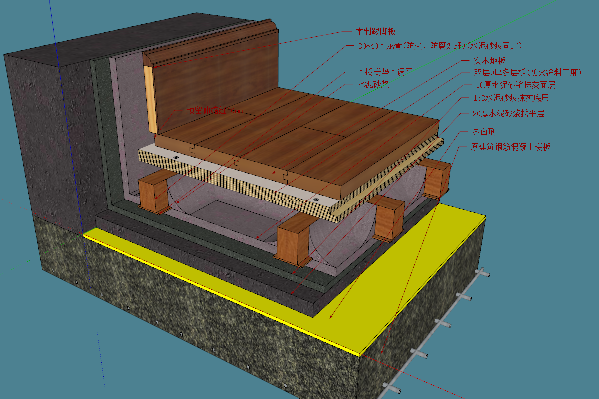 实木地板-多层板-木制踢脚线-木龙骨-防火-防腐-水泥砂浆-地坪节点剖面详图 积木 2026-03-09 地面节点 29 推广 实木地板(木龙骨基层) 1、原建筑钢筋混凝土楼板2、20厚水泥砂浆找平层3、1:3水泥砂浆抹灰底层4、10厚水泥砂浆抹灰面层5、木搁栅垫木调平6、30*40木龙骨(防火、防腐处理)(水泥砂浆固定)7、双层9厚多层板(防火涂料三度)(钢钉固定)8、实木地板 资源下载下载价格2 筑匠币VIP免费立即购买 0 0