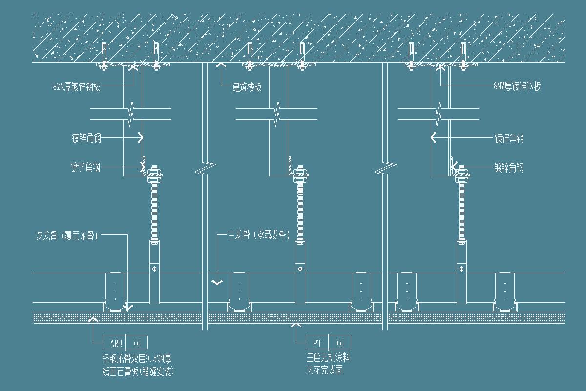 反支撑吊顶节点详图-镀锌钢板-镀锌角钢-主龙骨-次龙骨-纸面石膏板-涂料-天花节点剖面详图