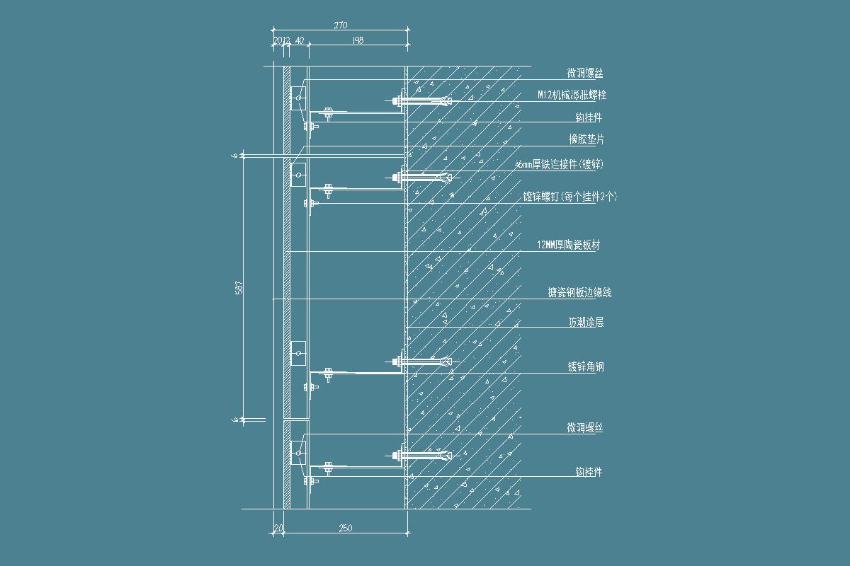 干挂瓷砖节点-膨胀螺栓-橡胶垫片-钩挂件-镀锌角钢-瓷砖