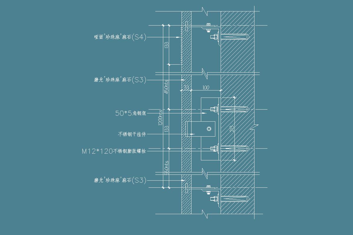石材干挂节点-50*5钢架-不锈钢干挂件-不锈钢膨胀螺栓-石材