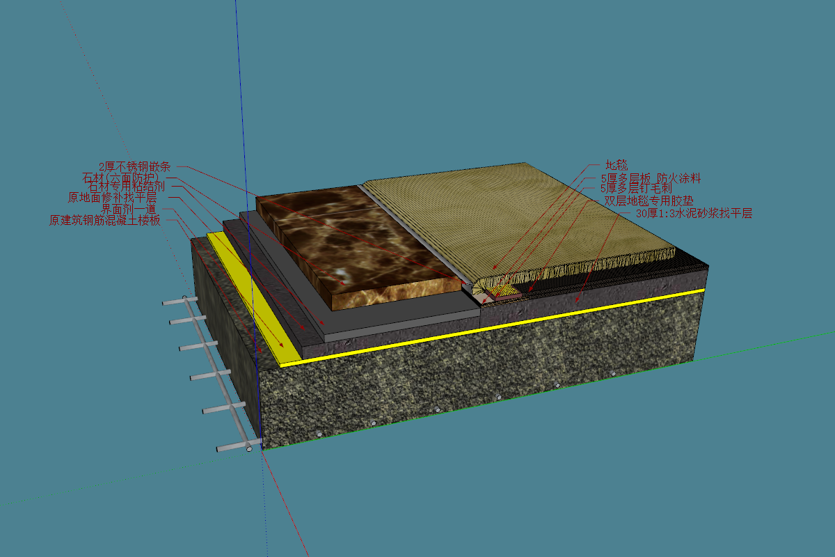 石材-石材专用粘结剂-原地面修补找平层-不锈钢嵌条-地毯-专用胶垫-1:3水泥砂浆-多层钉毛刺-多层板-防火涂料-地坪节点剖面详图 积木 2026-03-23 地面节点 28 推广 石材与地毯(7型不锈钢) 1、原建筑钢筋混凝土楼板2、原地面修补找平层3、石材专用粘结剂 界面剂处理涂刷4、石材(六面防护)5、原地面修补找平层6、30厚1:3水泥砂浆找平层7、双层地毯专用胶垫8、5厚多层板 防火涂料9、5厚多层钉毛刺10、3厚不锈钢嵌条11、地毯 资源下载下载价格2 筑匠币VIP免费立即购买 0 0