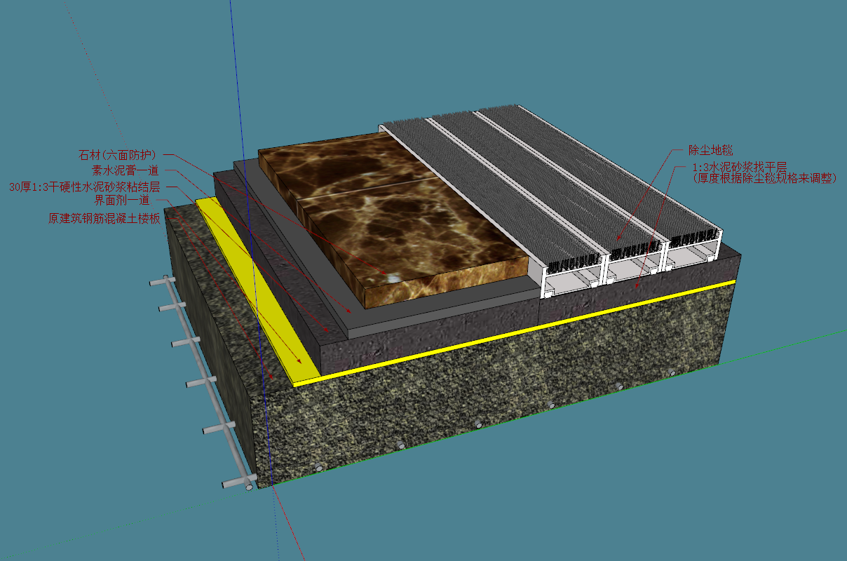 石材-素水泥膏-原地面修补找平层-不锈钢嵌条-地毯固定件-地毯-专用胶垫-1:3水泥砂浆-地坪节点剖面详图 积木 2026-03-23 地面节点 29 推广 石材与地毯(直接拼接) 1、原建筑钢筋混凝土楼板2、1:3水泥砂浆找平层(厚度依现场)3、地毯专用胶垫4、地毯5、30厚1:3水泥砂浆找平层6、30厚1:3干硬性水泥砂浆粘结层7、石材(六面防护) 注意事项:a、此节点工艺目前是较好的,适用宴会厅、客房、全日餐厅,过门坎石适用于此图 资源下载下载价格2 筑匠币VIP免费立即购买 0 0