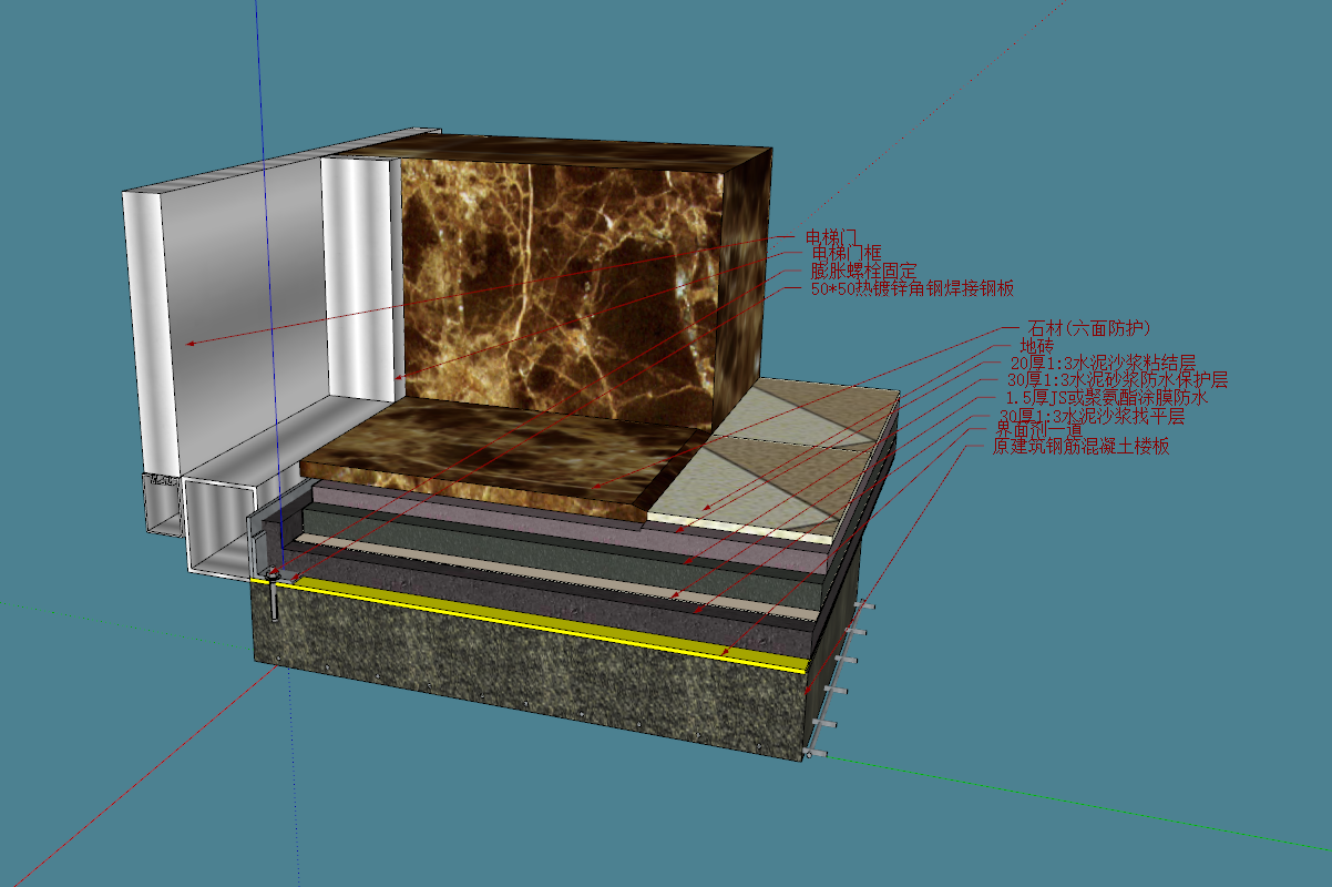 石材-电梯门-热镀锌角钢焊接钢板-膨胀螺栓-地砖-水泥沙浆粘结层-防水层-找平层-地坪节点剖面详图 积木 2026-03-24 地面节点 24 推广 石材与地砖(靠近电梯) 1、原建筑钢筋混凝土楼板2、30厚1:3水泥砂浆找平层3、1.5厚JS或聚氨酯涂膜防水层4、30厚1:3水泥砂浆防水保护层5、20厚1:3水泥沙浆粘结层6、地砖(8~12厚,干水泥擦缝或专用勾缝剂) 资源下载下载价格2 筑匠币VIP免费立即购买 0 0